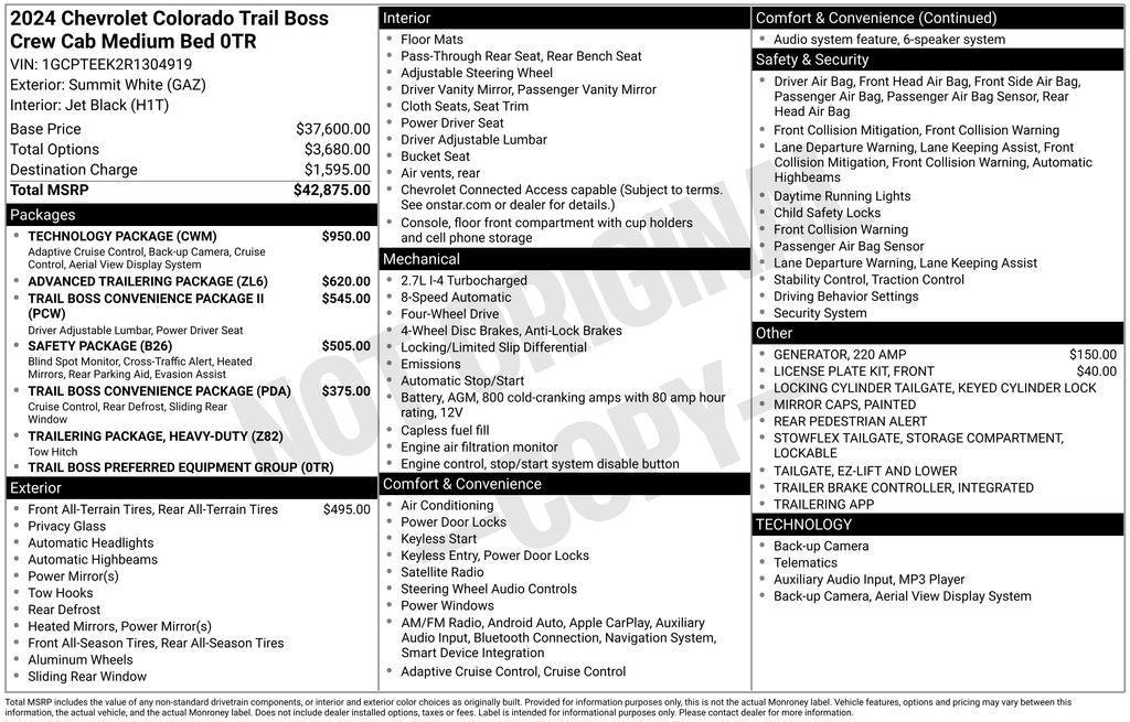 Why BUY from Gregg Young Chevy Omaha? When you choose this Summit White 2024 Chevrolet Colorado 4WD Trail Boss with 14,077 miles, you are not just buying a used vehicle - you are investing in quality, reliability and peace of mind. Our clientele depend on us for Transparent Pricing, Convenience and, most importantly, Customer FIRST Service! All purchases include 5 year Complimentary Maintenance Package, valued at over $1,000! CARFAX No Accidents! What this vehicle includes: Advanced Trailering Package ($620 value)Trailering AppHeavy-Duty Trailering PackageTrail Boss Convenience Package II ($545 value)8-Way Power Driver Seat AdjusterPower Driver Lumbar Control Seat AdjusterTailgate Keyed Cylinder LockStowFlex Tailgate Storage CompartmentEZ-Lift and Lower TailgateTrail Boss Convenience Package ($375 value)Manual Rear-Sliding WindowRear-Window Electric DefoggerElectronic Automatic Cruise ControlSafety Package ($505 value)Heated Power-Adjustable Outside MirrorsBlack Painted Mirror CapsRear Park AssistRear Cross Traffic BrakingBlind Zone Steering Assist with TraileringTechnology Package ($950 value)Tailgate Keyed Cylinder LockAdaptive Cruise ControlRear Pedestrian AlertHD Surround VisionPreferred Equipment Group 0TRChevy Safety Assist Safety and Security Forward collision mitigation - Forward thinking. You look away for just a second and suddenly the vehicle in front of you has stopped. That's when the forward collision mitigation system comes to life. When it senses an impending impact, it will activate a combination of features to help prevent or reduce the severity of an accident. Forward collision mitigation is always looking ahead. Pedestrian impact prevention - An extra step toward safety. Pedestrians don't always stop, look, and listen, but with Pedestrian Impact Prevention, your vehicle is equipped to better see them and avoid them. This system constantly monitors the road ahead to identify and track pedestrians. It projects that image to an interior display screen, AND should an impact become likely, Pedestrian impact prevention takes steps to avoid a collision. Rear camera - Watching your back! The rear camera helps you see obstacles and hazards you otherwise couldn't by showing enhanced images of what is behind you. The rear camera is an extra set of eyes that's both convenient and safe.Technology and Telematics Apple CarPlay/Android Auto smart device wireless mirroring Mobile hotspot - WiFi on the fly. Connect your devices to the Internet through your vehicles private mobile hotspot and take the internet wherever your journey takes you, without eating up your data allowance. Find the hotspot with mobile hotspot. EMISSIONS, FEDERAL REQUIREMENTS, ENGINE, TURBOMAX, TRANSMISSION, 8-SPEED AUTOMATIC, REAR AXLE, 3.42 RATIO, WHEELS, 18" X 8.5" (45.7 CM X 21.6 CM), BLACK HIGH GLOSS ALUMINUM, TIRES, LT275/65R18C, BLACKWALL, GOODYEAR WRANGLER TERRITORY, 32" OD MT, TIRE, SPARE 265/70R17SL ALL-SEASON, BLACKWALL, SUMMIT WHITE, SEATS, FRONT BUCKET, JET BLACK, CLOTH SEAT TRIM, 11.3" DIAGONAL ADVANCED COLOR LCD DISPLAY WITH GOOGLE BUILT-IN, TECHNOLOGY PACKAGE, ADVANCED TRAILERING PACKAGE, TRAIL BOSS CONVENIENCE PACKAGE II, SAFETY PACKAGE, TRAIL BOSS CONVENIENCE PACKAGE, GENERATOR, 220 AMP, TRAILERING APP, TRAILER BRAKE CONTROLLER, INTEGRATED, TRAILERING PACKAGE, HEAVY-DUTY, LOCKING CYLINDER TAILGATE, KEYED CYLINDER LOCK, MIRRORS, OUTSIDE HEATED POWER-ADJUSTABLE, MIRROR CAPS, PAINTED, LICENSE PLATE KIT, FRONT, TAILGATE, EZ-LIFT AND LOWER, STOWFLEX TAILGATE, STORAGE COMPARTMENT, LOCKABLE, SEAT ADJUSTER, DRIVER 8-WAY POWER, SEAT ADJUSTER, POWER DRIVER LUMBAR CONTROL, WINDOW, REAR-SLIDING, MANUAL, ADAPTIVE CRUISE CONTROL, DEFOGGER, REAR-WINDOW ELECTRIC, REAR CROSS TRAFFIC BRAKING, HD SURROUND VISION, REAR PARK ASSIST, BLIND ZONE STEERING ASSIST WITH TRAILERING, REAR PEDESTRIAN ALERT When you choose a Certified Pre-Owned vehicle from Gregg Young, youre not just buying a used car youre getting extra protection, added peace of mind, and built-