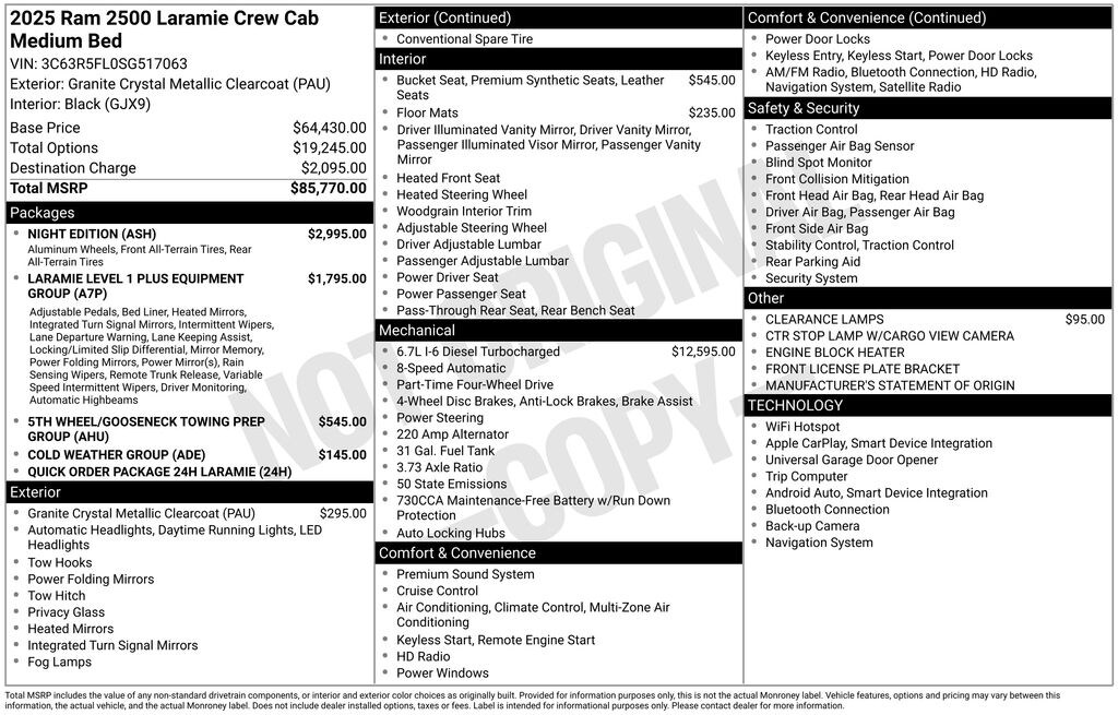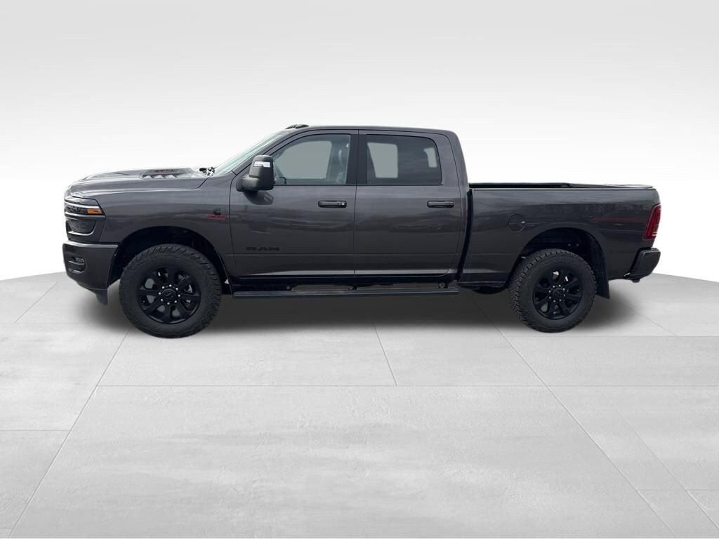Our Diesel powered 2025 RAM 2500 Laramie Crew Cab 4X4 Night Edition is for drivers determined to get more done in Granite Crystal Metallic! Powered by a TurboCharged 6.7 Liter High Output Cummins Diesel 6 Cylinder supplying 430hp and 1075lb-ft of torque to an 8 Speed Automatic transmission for titanic strength. Well-equipped for hard work, this Four Wheel Drive truck combines a heavy-duty suspension and a Class V receiver hitch to help you haul, and it has an impressively uplevel exterior. Highlights include LED lighting, fog lamps, heated power trailer mirrors, and our Night Pack for 20-inch black wheels, black badging, and other dark details.